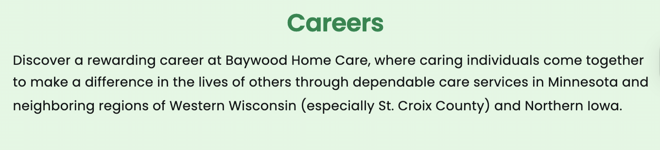 Baywood wanted their Careers page to feel less like a job listing and more like an invitation to join a meaningful career. I rewrote the content to speak directly to caregivers, showing the value of the work, the supportive culture caregivers can expect, and the rewarding experience of being part of their team.